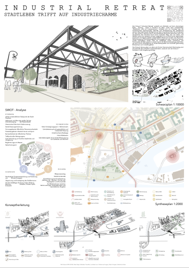 Ein besonders gelungener bestandsorientierter Entwurf, der das Stahlgerüst inszeniert. Einer intensiven Auseinandersetzung mit den Maßen des Gerüsts folgen hier praktische und kreative Bauelemente, die den neuen Städtebau mit dem bestehenden Stahlgerüst verbinden. Die öffentliche Nutzungen entlang der Quartierspassage unter dem Stahlgerüst verortet.